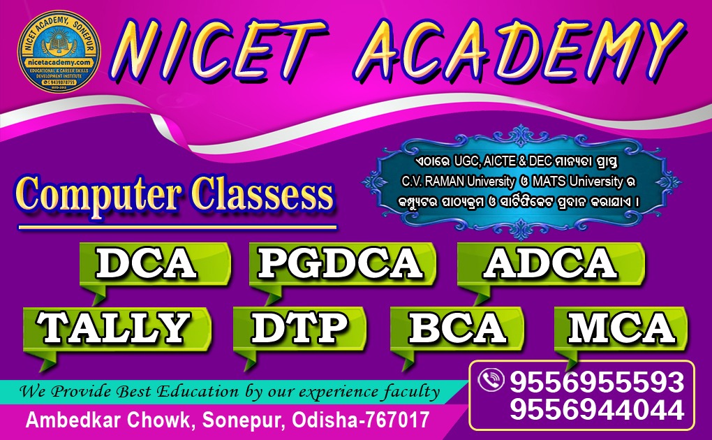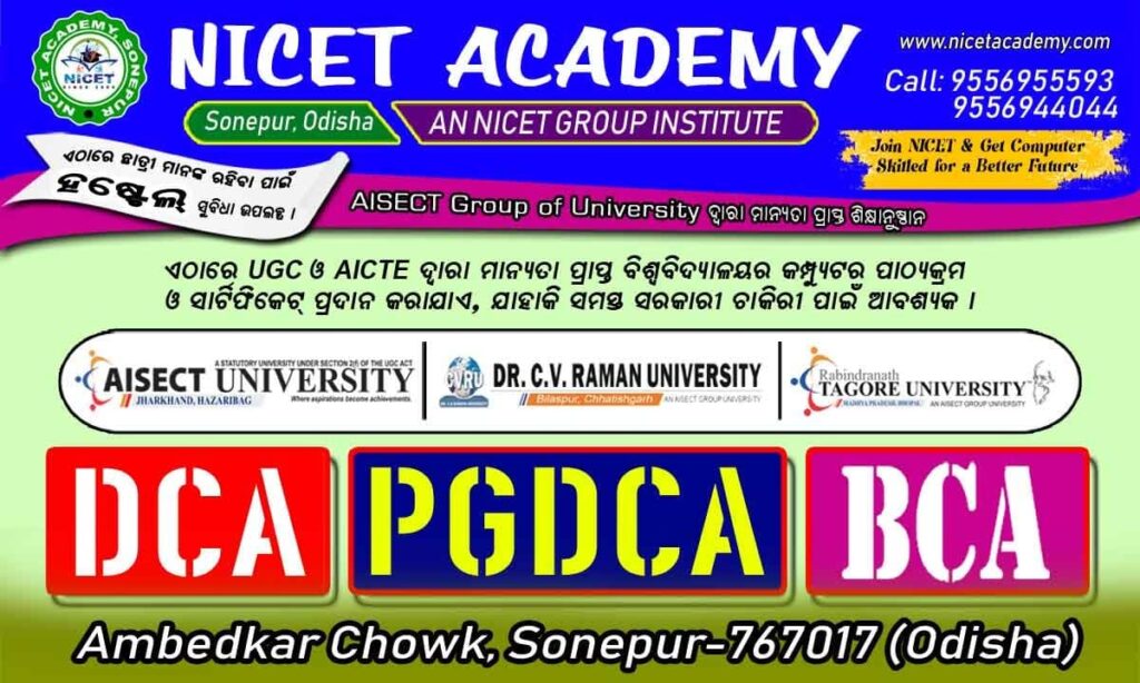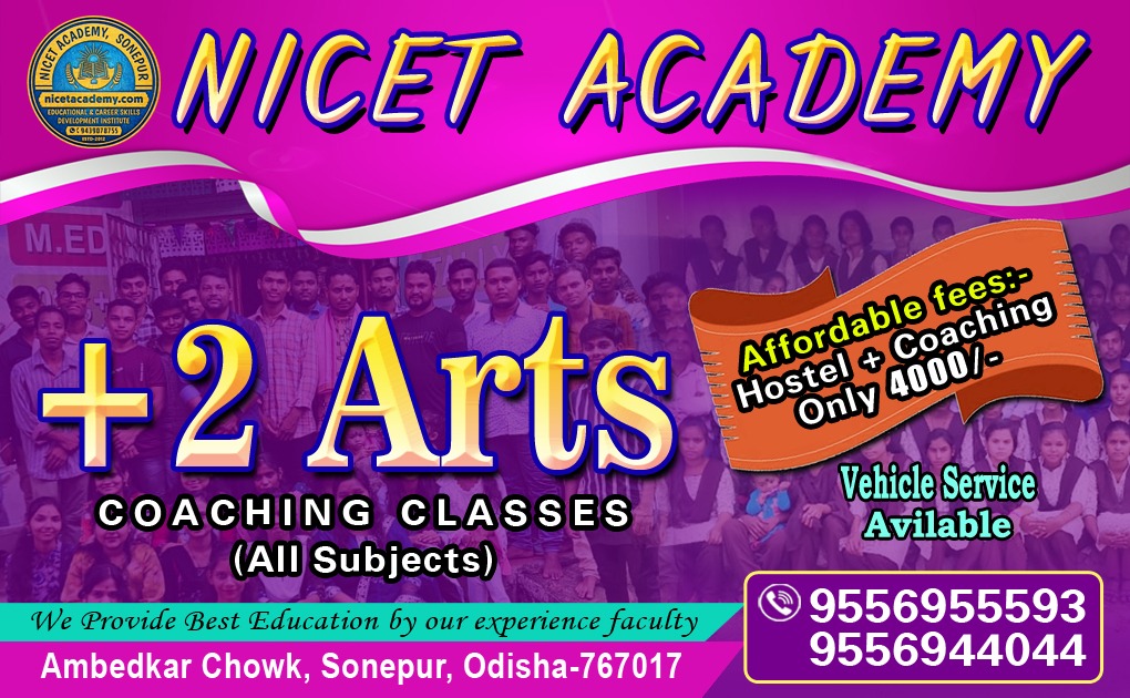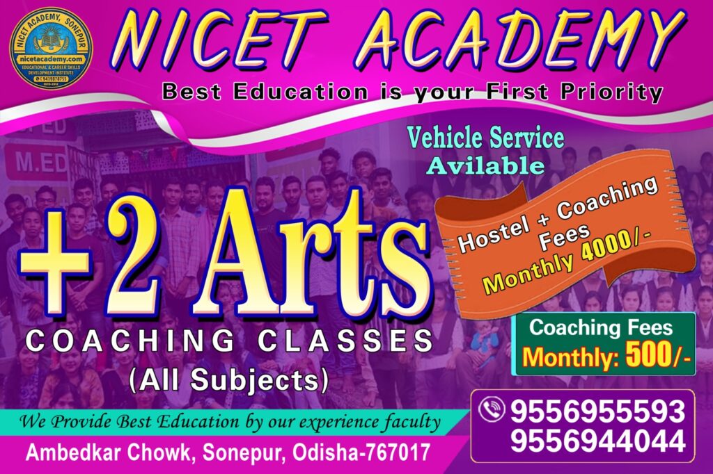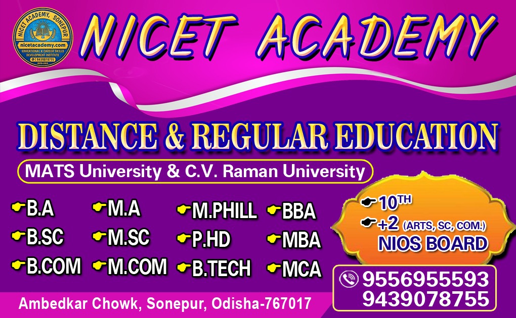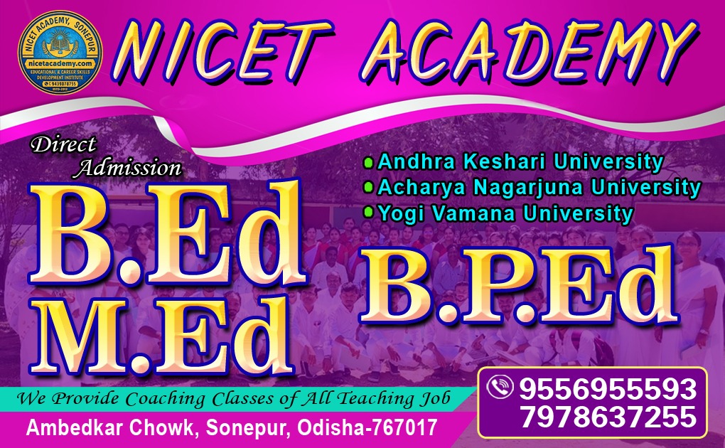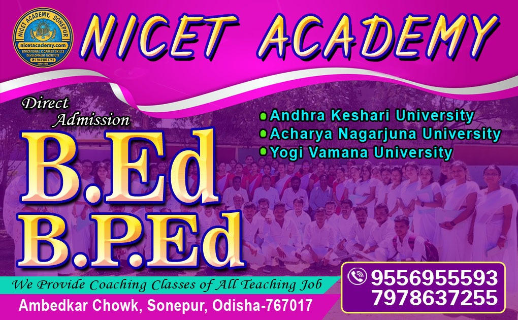 Empower Your FutureNICET ACADEMY SONEPUR“An education institute is not just a place to learn, but a foundation where dreams are built, potential is unlocked, and futures are shaped.”Get Started Our CoursesNICET ACADEMY SONEPUR 01.B.ED(B. Ed. or BEd) is an undergraduate academic degree which prepares students for work as a teacher in schoolsRead More 02.BCABCA full form is a Bachelor of Computer Applications.It’s a 3-year degree that equips you to build software applicationsRead More 03.+2 ArtsArts stream involves different subjects such as visual arts, humanities, literary arts and performing arts. Read More Show More Our StoryNICET ACADEMY SONEPUR NICET Academy in Sonepur, Odisha, stands out for its dedicated faculty, modern facilities, and student-centered approach, fostering academic excellence and personal growth in a supportive learning environment.Read More Ready to Dive In? Get Started Explore Our CampusTake a Virtual Tour of Our Cutting-Edge Facilities Why Choose UsOur Unique Value Propositions Expert InstructorsLearn from experienced professionals dedicated to your success Hands-On LearningGain practical skills through interactive, real-world projects Personalized AttentionReceive individualized guidance to maximize your learning potential Start Your JourneyReady to Transform Your Career with Nicet?Take the first step towards a successful IT career. Enroll now!Get Started